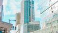 信濃川から見た朱鷺メッセ全景、ガラス張りの建物と高層ホテル